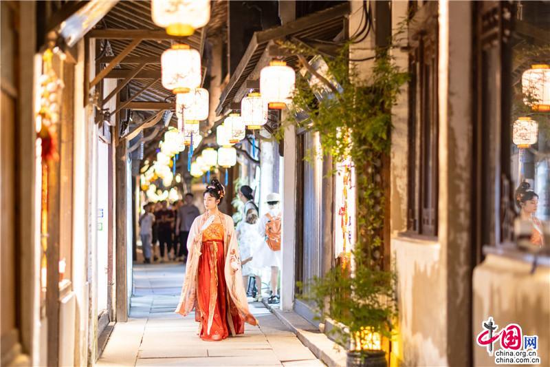 歸來小鎮(zhèn),夜色燈火閃爍搖曳,廊亭中清風肆意流連,明月照進街巷里弄,清涼夜周莊,是夏日里的烏托邦。小橋流水與青磚黛瓦交錯成景,輕姿漫步看兩岸燈影交錯;成蔭的綠意里畫著水色繾綣,抬眸皆是神來之筆。夏夜的煙火人間里,是迷人而慵懶的江南底色。