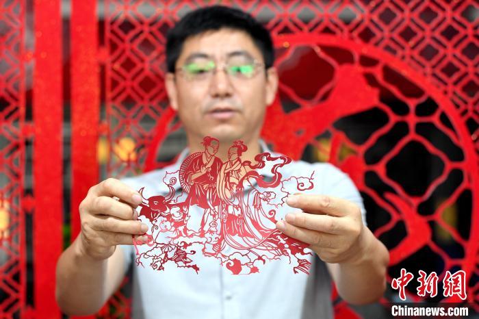 尤金水展示《鵲橋相會》剪紙作品 苗鳳強 攝