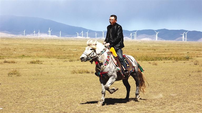 驅(qū)車向草原腹地進(jìn)發(fā),遠(yuǎn)遠(yuǎn)就能看見有人在馴馬。馴馬者房利軍和他的坐騎“尕青”仿佛“人馬合一”,同呼吸、共步調(diào),一遍遍練習(xí),像走,更像飛。這便是傳說中的走馬文化,和跑馬的加速度不同,走馬不管是走還是跑,都是快步勻速,短途速度快,長(zhǎng)途耐力強(qiáng),騎乘平穩(wěn),姿態(tài)優(yōu)美,觀賞性強(qiáng)。在牧區(qū),走馬實(shí)用性強(qiáng),深受當(dāng)?shù)厝藲g迎。曾有專家稱,“馬踏飛燕”的“馬”即為走馬。每天,和武威天祝一山之隔的這片草原,都與房利軍有關(guān),在這里,他專心馴馬,而他的500只羊則在一旁撒歡。尤其從高空俯瞰,草原牧羊的畫面甚是壯觀??赐犟Z馬,房利軍騎馬帶路,采訪車沿著馬道回到了“家”。