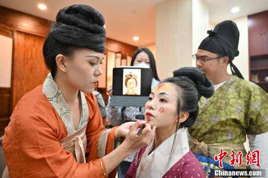 10月9日晚,廣西南寧市一攝影棚內(nèi),南寧傳統(tǒng)服飾復(fù)原團(tuán)隊化妝師鄭若楠依據(jù)陶俑文物圖片為模特上面妝。