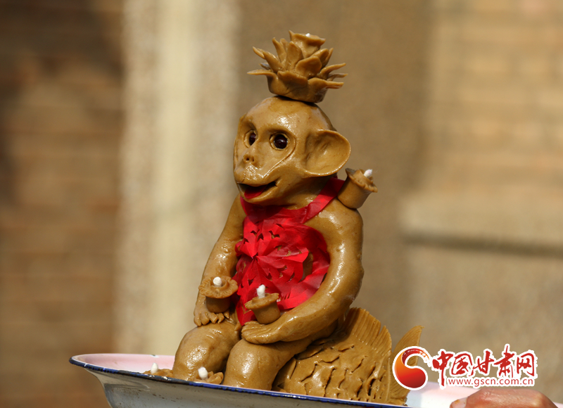 大面猴身上的面燈是專供一對(duì)新人來點(diǎn)的,所以面猴的做工尤為精心,在面猴的眼睛上還鑲嵌了明溜溜的黑豆,在胸前系著紅肚兜,看上去憨態(tài)可掬。