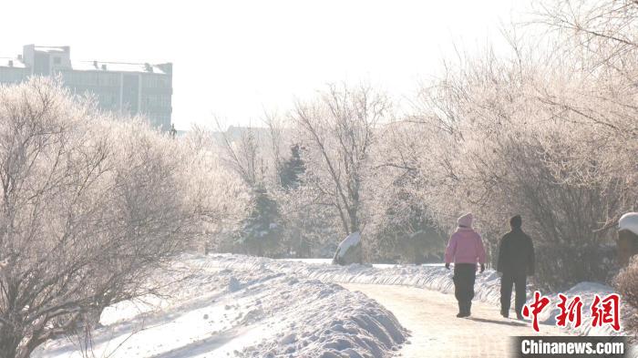 呼瑪縣居民欣賞霧凇美景。王婷 攝