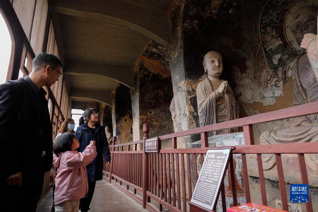 4月1日,游客在麥積山石窟參觀。新華社記者 方欣 攝