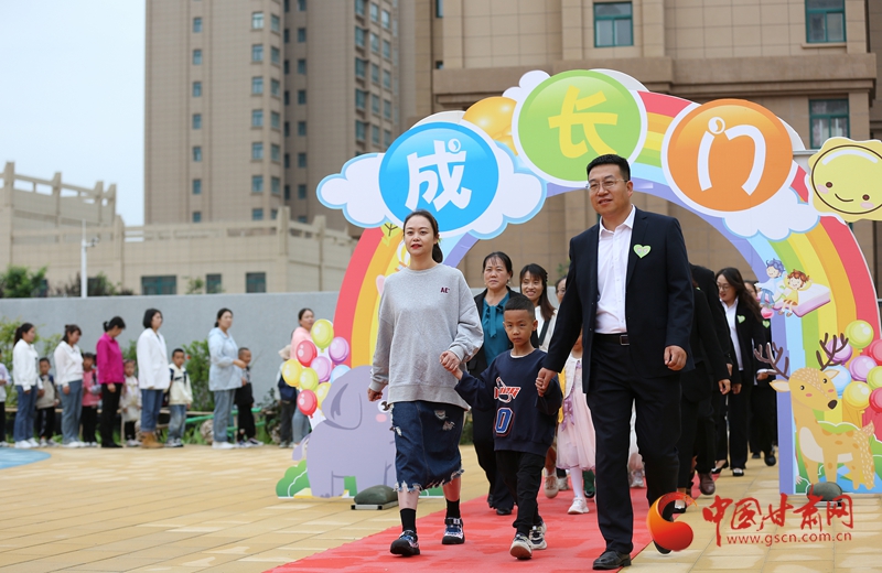 一年級(jí)新生在老師和家長(zhǎng)的陪伴下走過(guò)“成長(zhǎng)門”