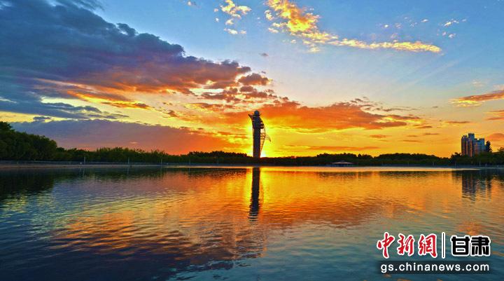 嘉峪關(guān)地標(biāo)性建筑氣象塔迎來日出。毛富 攝