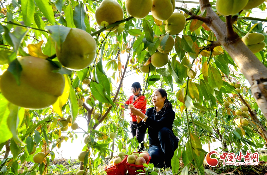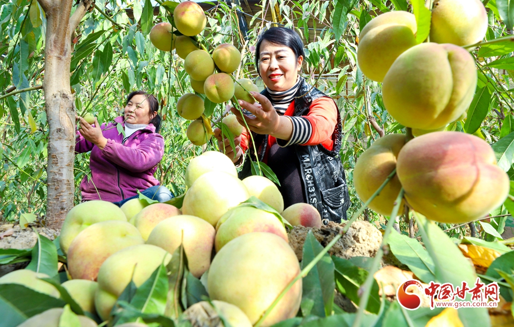 11月13日,甘肅省張掖市甘州區(qū)長(zhǎng)安鎮(zhèn)一果蔬種植專(zhuān)業(yè)合作社“甘泉雪桃”種植基地大棚內(nèi),種植農(nóng)戶(hù)正在采摘成熟的“甘泉雪桃”。