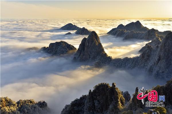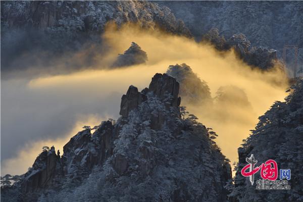 冬天的黃山絕美之處莫不過(guò)于雪景、霧凇、日出、云海同時(shí)出現(xiàn),1月5日雪后早晨一輪紅日冉冉升起,在陽(yáng)光的照耀下,放射出萬(wàn)丈光芒,在群峰間、奇松怪石上散發(fā)著金燦燦的光彩,給冬景增添神奇的色彩,美輪美奐宛如油畫(huà)。