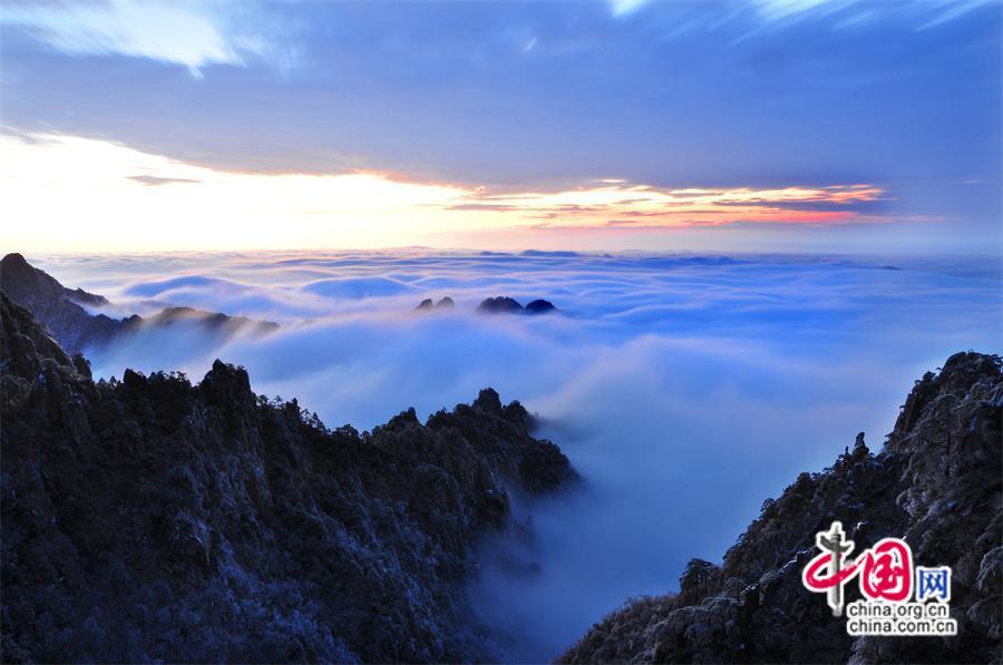 只有一個黃山:雪后云海日出朝霞描繪絢麗畫卷