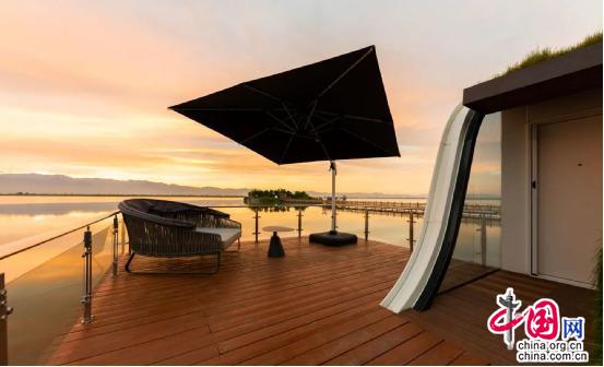 還有地球倉(cāng),與賀蘭山隔湖相望,超廣角的落地窗,猶如一個(gè)畫(huà)框,把房間外的風(fēng)景都放進(jìn)了畫(huà)框里。與其他不同的是,白天可將房間內(nèi)的自動(dòng)升降床上升至房頂,露出隱藏在床底的沙發(fā)和茶桌,臥室即可秒變“會(huì)客茶室”。