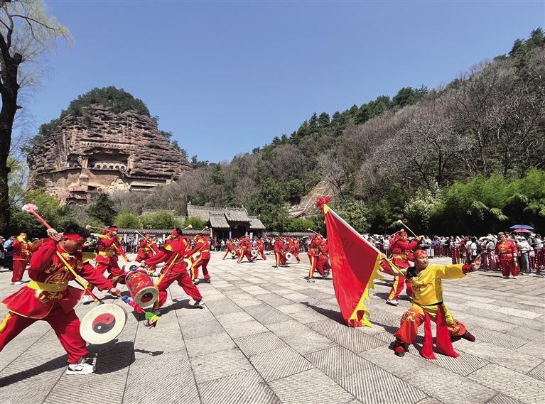 3月30日9時(shí),天水伏羲廟前人潮涌動(dòng),熱鬧非凡,來(lái)自蘭州的太平鼓隊(duì)以精彩絕倫的表演拉開蘭州助力天水麻辣燙文旅推廣活動(dòng)大幕。
