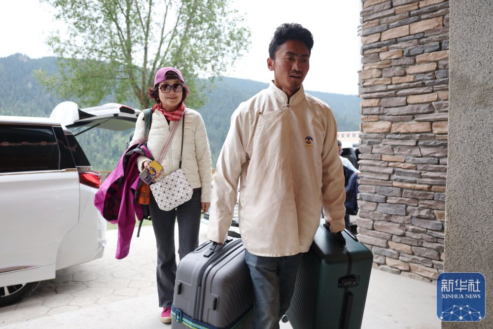 ↑ 扎尕那村一家民宿工作人員仁青(右)幫助前來住宿的游客搬運行李(6月27日攝)。新華社記者 陳斌 攝