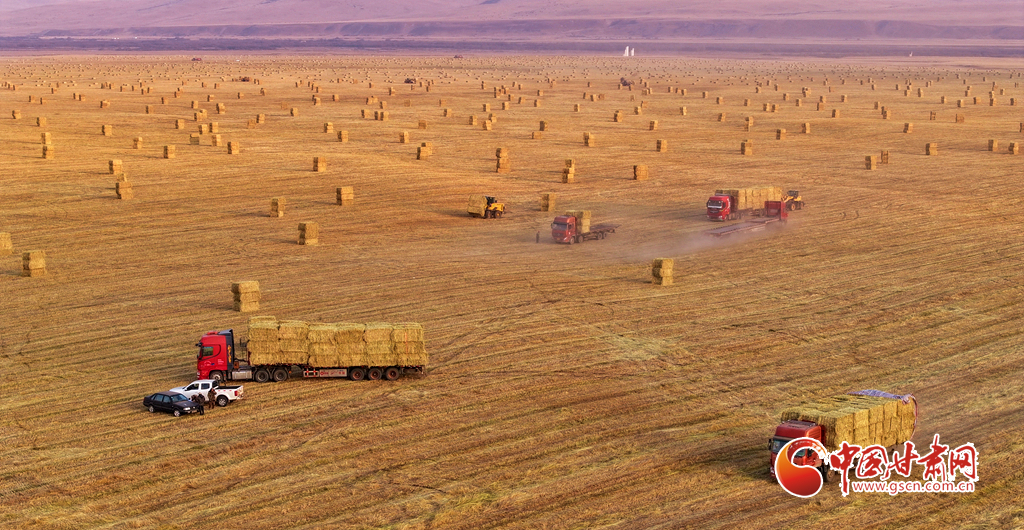 11月11日,甘肅山丹馬場的10萬畝燕麥草進(jìn)入打包高峰期,田野上呈現(xiàn)出一派繁忙而有序的景象。放眼田間,大型農(nóng)用機(jī)械來回穿梭,將燕麥草迅速壓縮、打包,一個個草捆整齊排列。與此同時,滿載草捆的運(yùn)輸車在田間小道上來回奔波,將成品送往倉庫和銷售地。