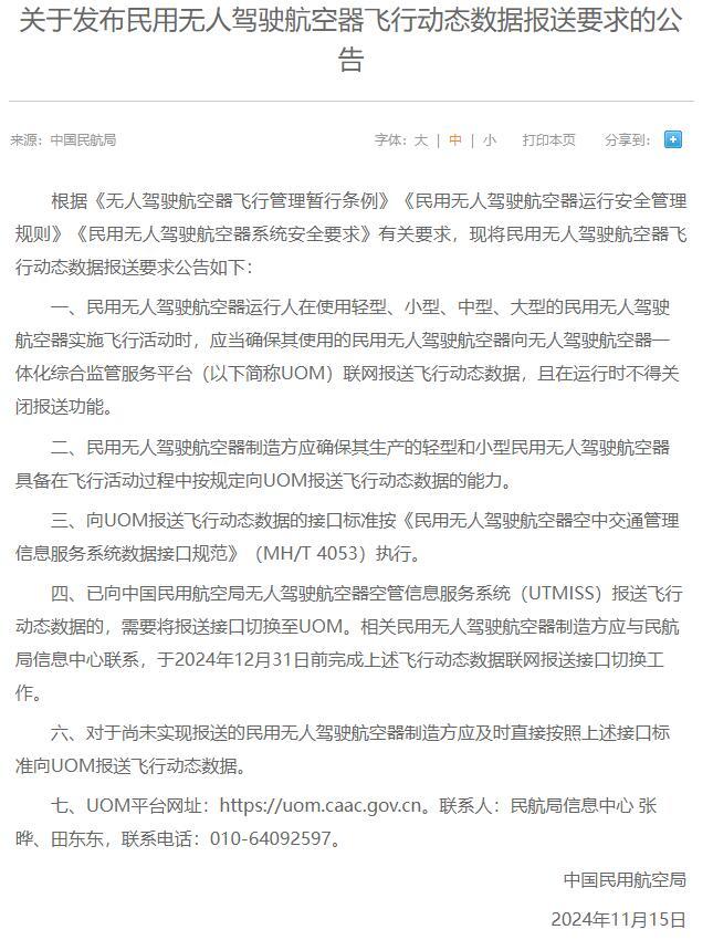 11月15日,民航局發(fā)布《關(guān)于發(fā)布民用無人駕駛航空器飛行動(dòng)態(tài)數(shù)據(jù)報(bào)送要求的公告》(以下簡(jiǎn)稱《公告》)。