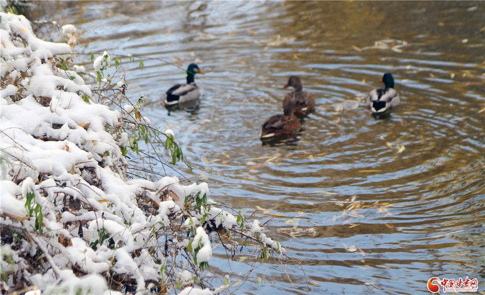 雪落湖畔,水鴨也“結伴”而游“賞”雪景。