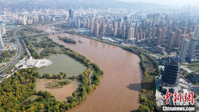 2024年10月31日,黃河蘭州段兩岸的斑斕秋色。 (無人機照片) 九美旦增 攝