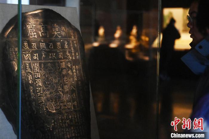 11月28日,甘肅省敦煌市,敦煌研究院敦煌石窟文物保護(hù)研究陳列中心,游人參觀《披沙揀金——敦煌研究院館藏文物擷英展》中的碑刻。該展由敦煌研究院主辦,2024年下半年煥新布展,展出了不同類型館藏文物,通過這些文物蘊含的豐富歷史信息,展現(xiàn)了敦煌文化的多元與包容,勾勒不同文明偕行共進(jìn)的歷史脈絡(luò)。中新社記者 李亞龍 攝