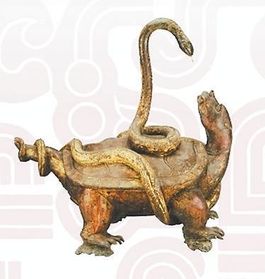 玄武是“四神”中的北方之神。《大戴禮》:“龜上彎象天,下平法地。千載神龜,問(wèn)無(wú)不知,廣育無(wú)雄,以蛇為雄。故龜與蛇合謂玄武”。因此龜蛇形象的組合亦有陰陽(yáng)交接之意。除了瓦當(dāng)、畫像磚、雕塑外,古人還常將此二物繪于旗上,用于指揮軍隊(duì)、消災(zāi)避害之用。