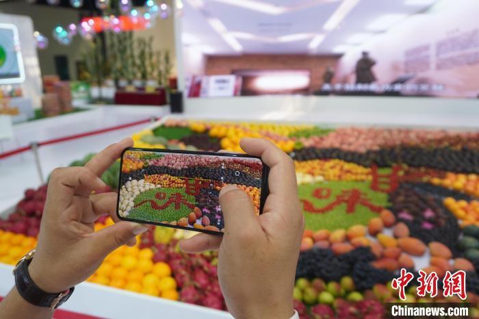 2022年7月10日,第二十八屆中國(guó)蘭州投資貿(mào)易洽談會(huì)展區(qū)展示甘肅地方特色產(chǎn)品。圖為參觀者手機(jī)拍攝用農(nóng)產(chǎn)品拼裝的“甘味”。(資料圖)九美旦增 攝