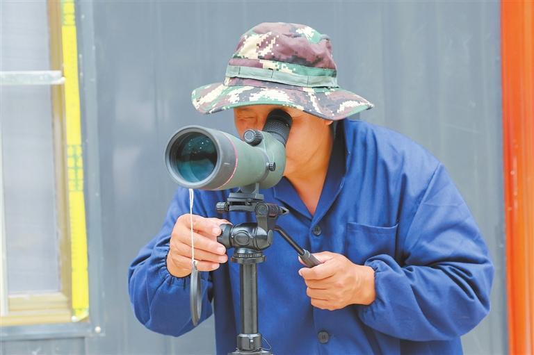 宋治平通過單筒望遠(yuǎn)鏡觀察朱鹮。 新甘肅·甘肅日報記者 馮樂凱