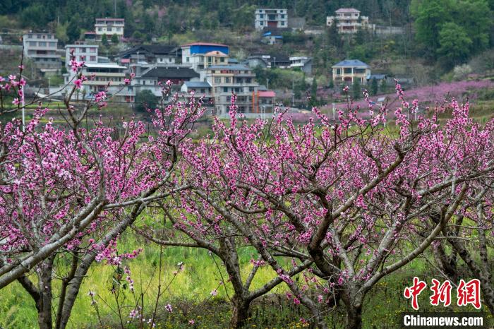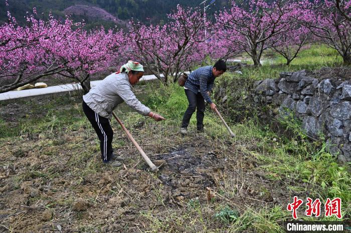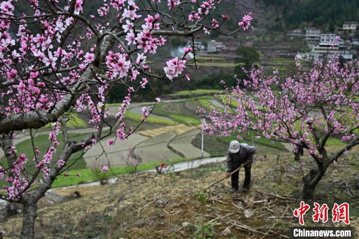 3月15日,在廣西田林縣浪平鎮(zhèn)浪平村,村民在桃樹下勞作。黃數(shù)情 攝