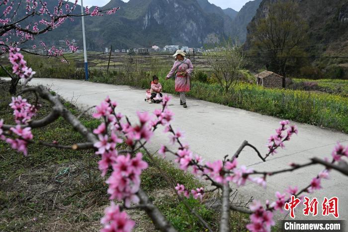 3月15日,在廣西田林縣浪平鎮(zhèn)浪平村,村民在桃樹旁走過。黃數(shù)情 攝
