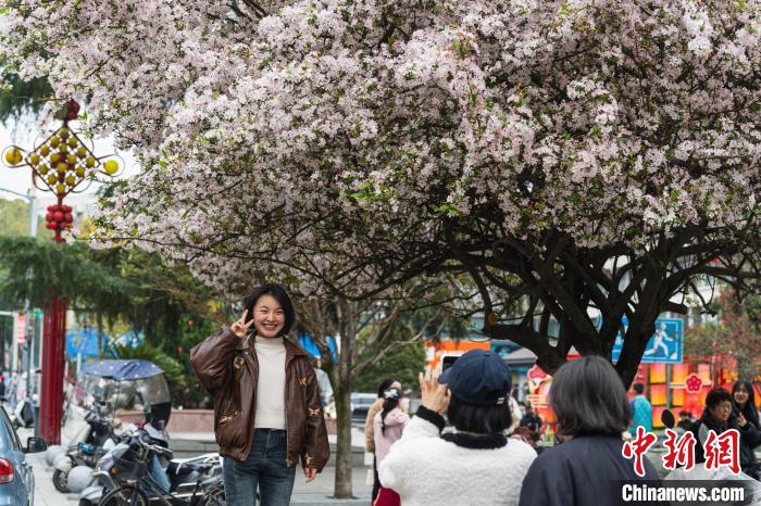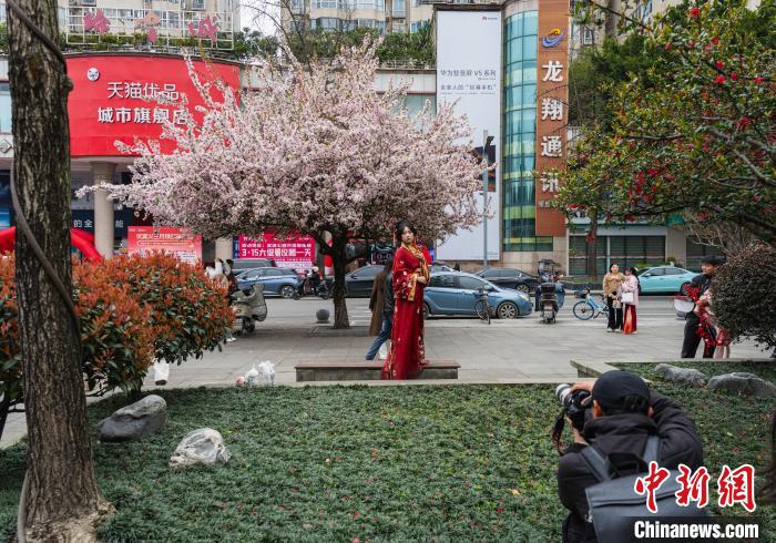圖為3月16日,棠湖公園正大門處,垂絲海棠盛開,市民在此拍攝寫真照。韓金雨 攝