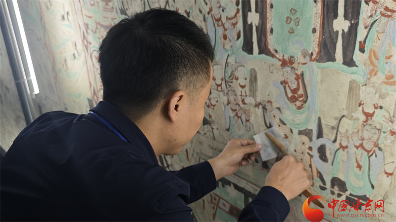 唐青松曾經(jīng)是一名莫高窟講解志愿者,在手電筒的柔和光源之下,他能更清楚看到壁畫(huà)里的病害,也更焦急如何更好保護(hù)壁畫(huà),所以當(dāng)有機(jī)會(huì)成為壁畫(huà)修復(fù)師,他便拿起了保護(hù)工具,用五年時(shí)間傾心學(xué)習(xí),終于有了走進(jìn)洞窟修復(fù)壁畫(huà)的機(jī)會(huì)。