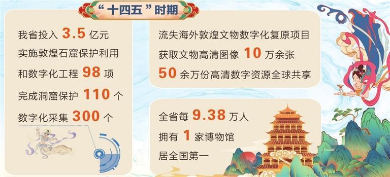 在文物保護提質(zhì)升級方面,我省投入3.5億元,實施敦煌石窟保護利用和數(shù)字化工程98項,完成洞窟保護110個、數(shù)字化采集300個,建成全球首個文物保護多場耦合實驗室,制定國家和行業(yè)標(biāo)準(zhǔn)27項,科研成果服務(wù)16省市及部分共建“一帶一路”國家;流失海外敦煌文物數(shù)字化復(fù)原項目獲取文物高清圖像10萬余張,50余萬份高清數(shù)字資源全球共享;第四次全國文物普查新發(fā)現(xiàn)線索4659條,投入24.26億元實施900余項重要文保項目;打造河西走廊國家遺產(chǎn)線路,創(chuàng)建嘉峪關(guān)長城國家文物保護利用示范區(qū),全省文物系統(tǒng)性保護成效顯著,“中國特色?敦煌經(jīng)驗”國際影響力持續(xù)提升。