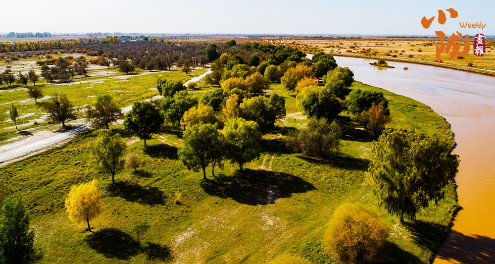 金色胡楊在陽光下泛著溫暖光澤,斑斕絢麗的蘆葦如金色絲帶點綴荒漠,與碧綠河水、湛藍(lán)天空構(gòu)成濃墨重彩的秋日圖景。