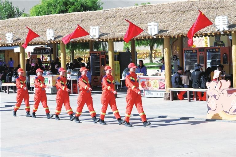 敦煌市消防救援大隊(duì)“九色鹿”女子服務(wù)隊(duì)在景區(qū)開(kāi)展消防安全動(dòng)態(tài)巡查。