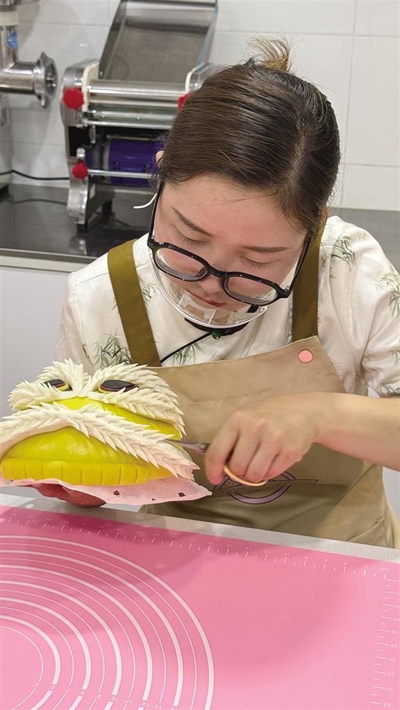走進楊曉蘭的花饃小店,濃郁面香裹挾著藝術氣息撲面而來。展架上,威風凜凜的醒獅昂首欲嘯,憨態(tài)可掬的卡通角色惹人喜愛,盤踞的靈蛇栩栩如生……此刻,她正凝神制作醒獅花饃,搓、捏、塑形,面團在她指尖迅速呈現(xiàn)出獅頭的威武雛形。