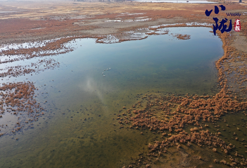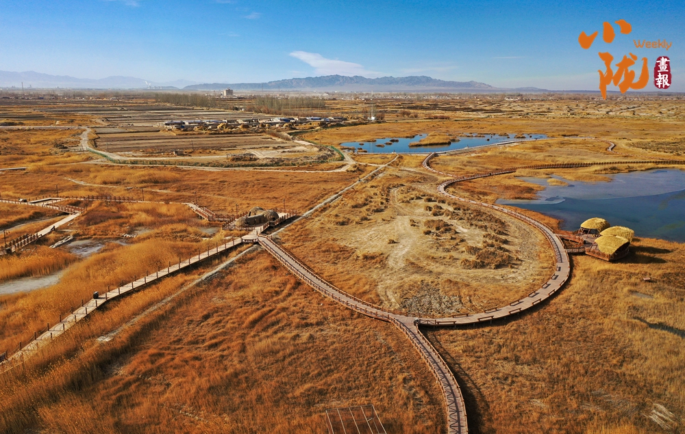 濕地安然舒展在沙海與蒼穹之間,仿佛大地的眼眸。它與蒼茫四野悄然融合,共同勾勒出一幅“水漾金沙,色染冬暝”的自然水墨。